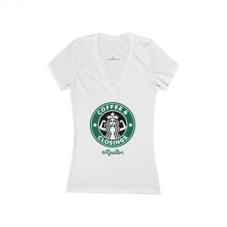 “Coffee and Closings” Women’s Jersey Short Sleeve Deep V-Neck Tee